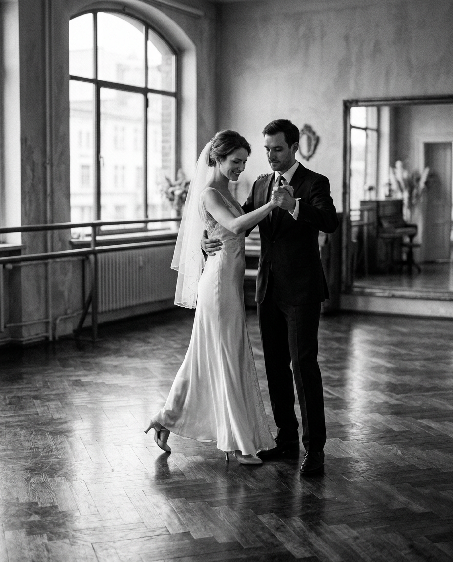 Die letzte Studio-Stunde — idealerweise 5–7 Tage vor der Hochzeit — ist die wichtigste. Wir gehen die Choreografie zwei- bis dreimal komplett durch, mit Schuhen, mit Konzentration, ohne Korrekturen. Das ist die Probe, die Ihrem Nervensystem zeigt: „Wir können das."